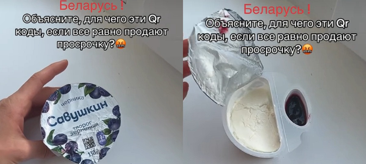 «Патлумачце мне, калі ласка: зрабілі вось гэтыя афігенныя QR-коды, па якіх тавары быццам бы не будуць пратэрмінаваныя і ўсё гэта будзе ў сістэме, і бла-бла-бла… Адкрываю я, значыцца, тваражок і бачу яго ў такім выглядзе. Сёння ў нас 4-е чысло. Тэрмін даўніны быў да трэцяга. І куды звяртацца?», — задаецца пытаннем аўтарка роліка.