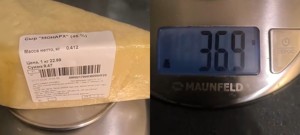 Сыр «Манарх», які набыў мужчына, каштаваў амаль 30 бел. руб. за кілаграм і амаль 10 — за кавалак. Сума, заяўленая на цэнніку, налічвала 412 грамаў. Аднак, калі аўтар відэа ўзважыў сыр на кантрольных вагах, там сума была іншая — 369 грамаў, менш на 43 грама.