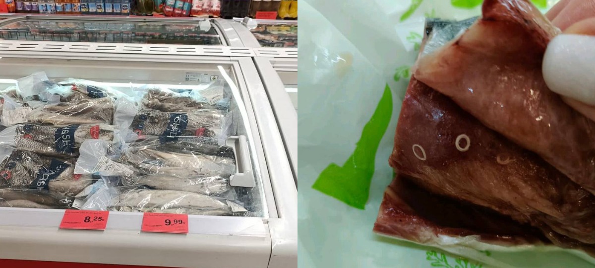 У слуцкай краме «Маяк» пакупнікі заўважылі скумбрыю з незвычайнымі белымі кольцамі, якія выглядаюць як паразіты.