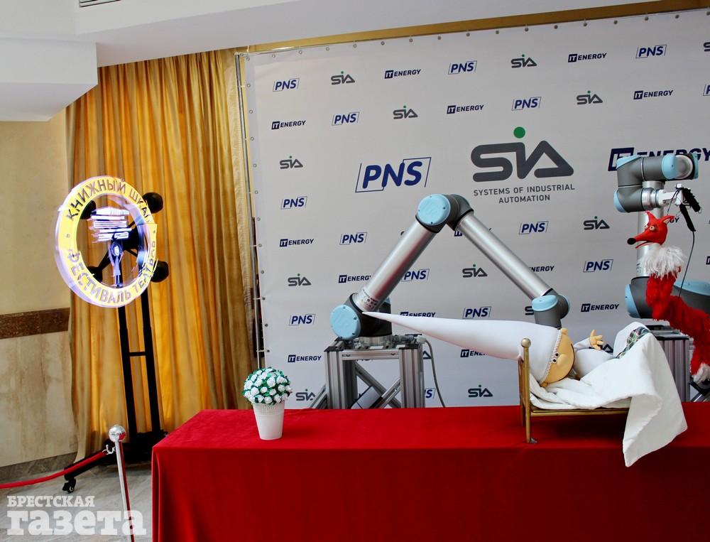 На фестивале представлены коботы — роботы, которые безопасно работают рядом с человеком. Здесь роботы управляют куклами: лисой и гномиком. Увидеть их можно в главном холле театра на первом этаже. Время представления — 5 минут.