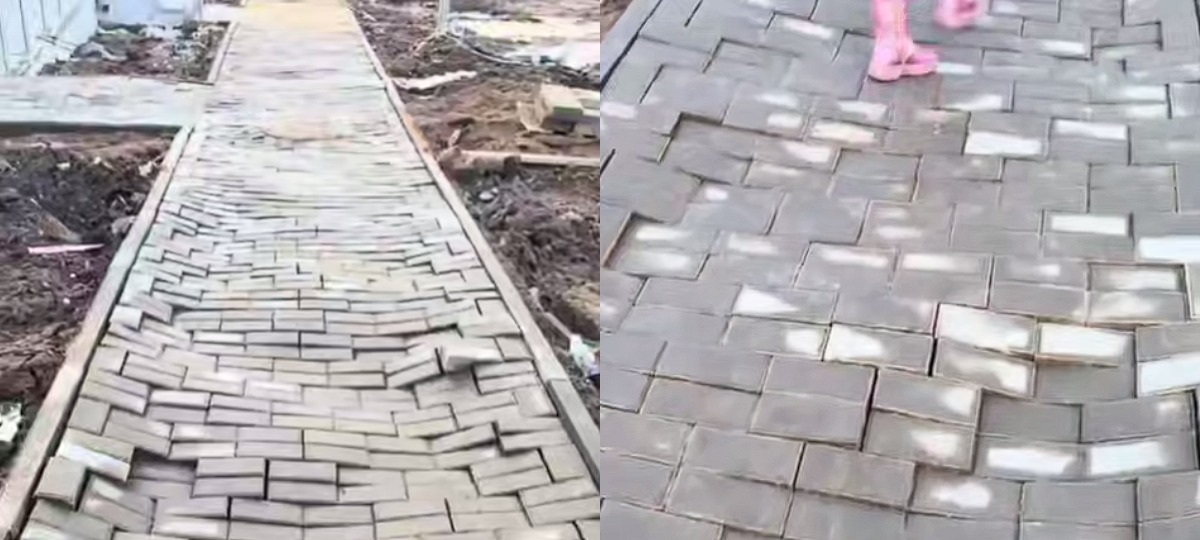 На кадрах відаць, што пакрыццё атрымалася вельмі няроўным: плітка месцамі выступае, паміж элементамі ёсць перакосы, а сама дарожка выглядае хвалістай. Асобныя ўчасткі нібыта «паплылі» — шэрагі не супадаюць, а паверхня месцамі ўздымаецца і правальваецца. У выніку тратуар не толькі выглядае неакуратна, але і можа быць небяспечным для пешаходаў.