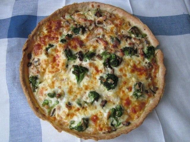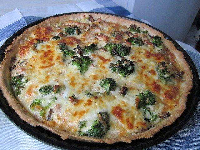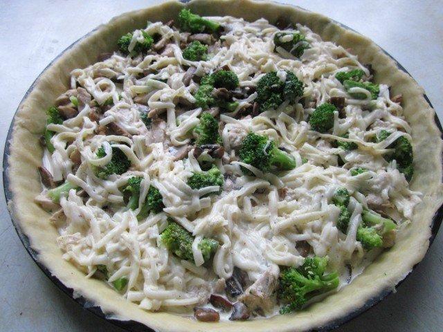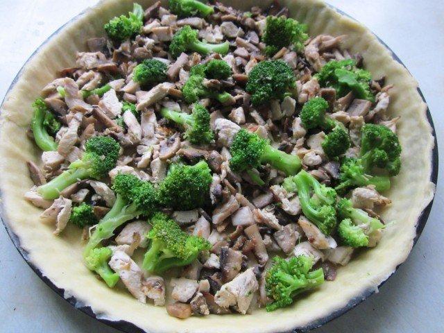 Надо: для теста: 50 г сливочного масла, 1 яйцо, 3 ст. л. холодной воды, 200 г муки, 0,5 ч. л. соли; для начинки: 300 г куриного филе, 400 г грибов, 200 г брокколи, 100 г лука, растительное масло, соль; для заливки: 200 мл сливок 25%, 150 г сыра, 2 яйца, 1 ч. л. молотого мускатного ореха.