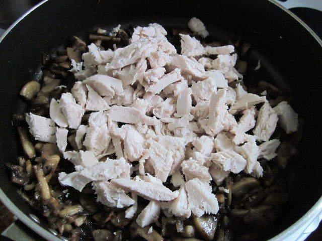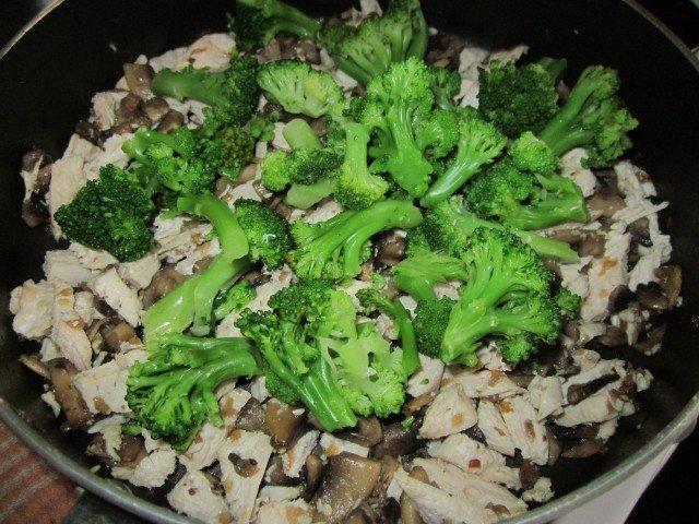 Приготовьте начинку. Куриное филе отварите и остудите. Мелко нарежьте курицу и лук. Грибы порежьте на небольшие кусочки. На растительном масле обжарьте лук. Добавьте грибы, жарьте 10 минут. Посолите. Добавьте филе, следом — брокколи. Жарьте еще 10 минут и остудите.