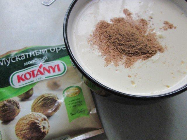 Теперь приготовьте заливку. Яйца немного взбейте. Добавьте сливки, перемешайте. Сыр натрите, добавьте его к яичной смеси. Туда же насыпьте мускатный орех. Перемешайте. Если необходимо, посолите.