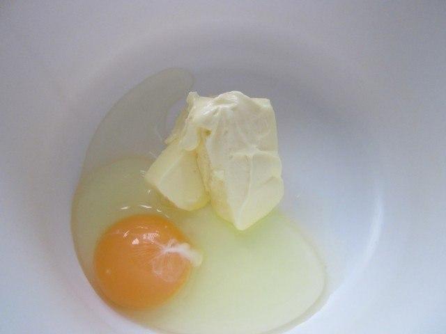 Готовим: Масло перемешайте с яйцом (однородности массы добиваться не надо). Добавьте воду, муку и соль, замесите тесто. Заверните тесто в пищевую пленку и положите в холодильник на 30 минут.