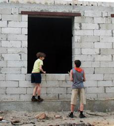 Мои «экскурсоводы» сообщили, что проводят здесь чуть ли не каждый день. А где ж еще? «В лагерь летний мы не ходим. Что там делать? Зачем платить деньги, если мячик дадут, в спортзал или на стадион запустят, и делай что хочешь? — размышляет о возможностях летнего отдыха М. — Хоть и воняет местами, мы все равно здесь тренируемся, занимаемся паркуром. У меня брат крутой паркурщик, знаете его?» Вообще-то ребята ходят в секции и кружки, например, по волейболу, «но летом ничего не работает». Ясно, что стройка манит скучающих детей магнитом. Тем более что находится она в 20 м от подъезда, в самом дворе, где, кроме металлических стоек для сушки белья, развлечений никаких.
