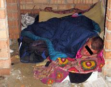 Действительно, в одном из закоулков недостроя в груде тряпья спал мужчина. Разбуженный вспышкой от фотоаппарата, он начал недовольно мотать головой, но подняться у него сил не было. На вопрос, живет ли он здесь, промычал «да». Мы оставили его в покое. Было заметно, что гости тут мы, а он обосновался давно: в соседнем закутке закопченные стены и импровизированный очаг из кирпичей.