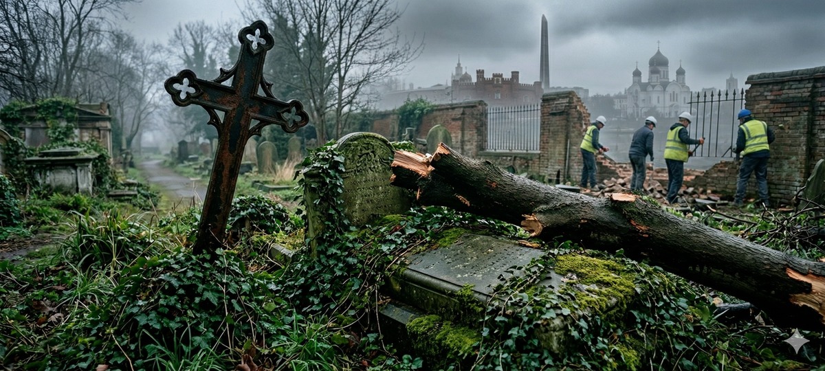 Разрушение Тришинского кладбища в Бресте. Изображение сгенерировано в Google Nano Banana 2