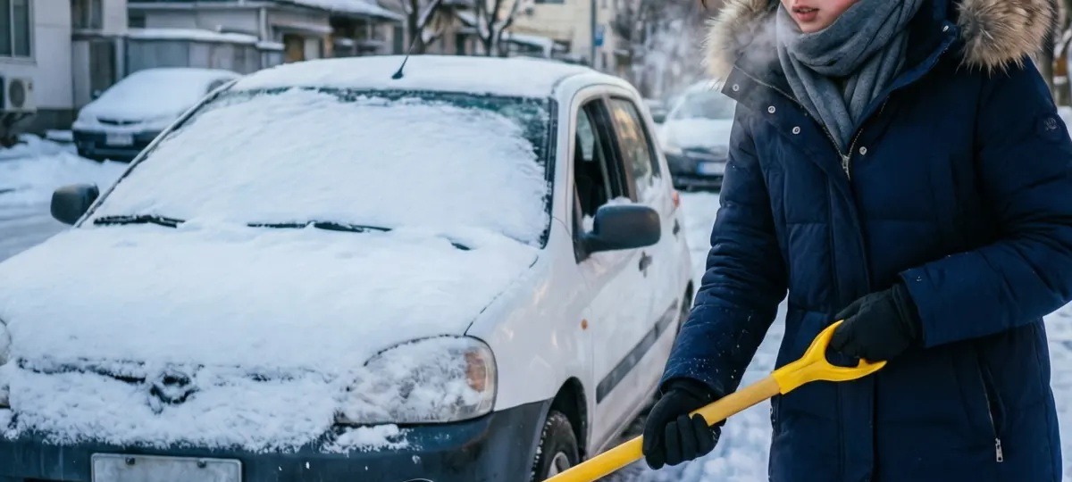 Девушка очищает парковку от снега. Иллюстративное фото