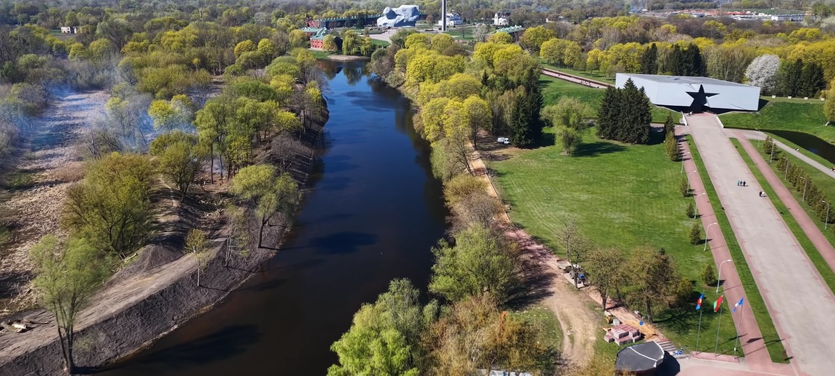 Ремонт красной дорожки (справа вдоль Мухавца) в Брестской крепости с высоты птичьего полета. Скриншот видео
