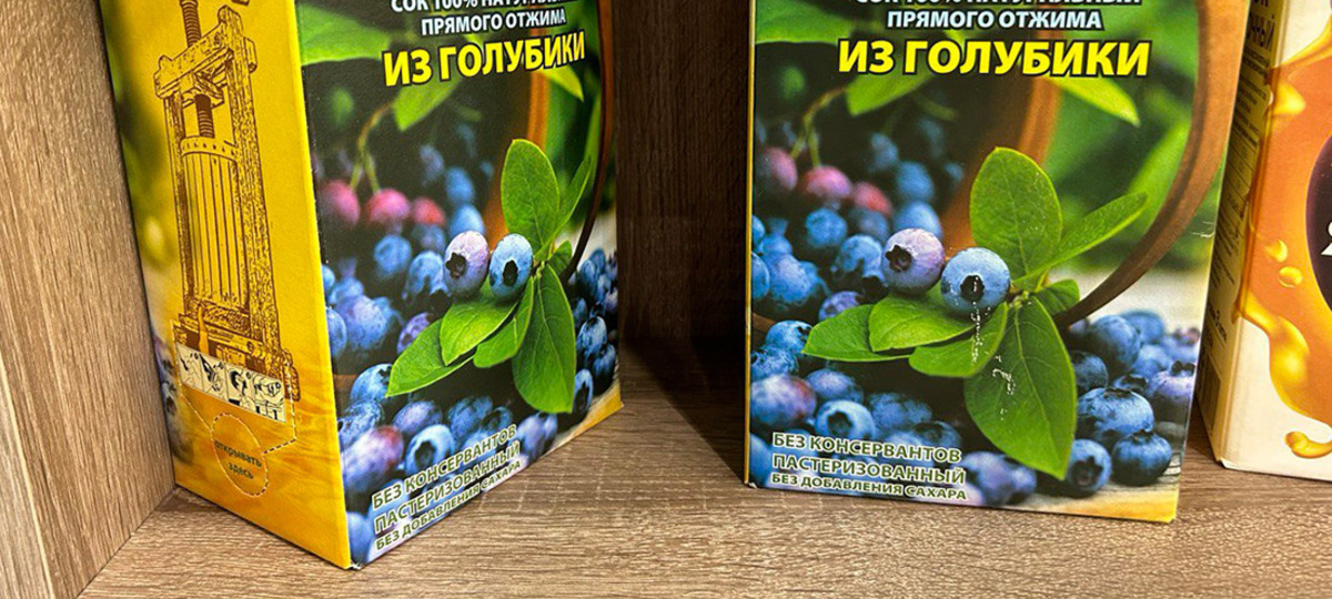 Три литра голубичного сока упаковывают в бумажный пакет вместо стеклянной банки. В составе только сок прямого отжима, сахар не добавляют. В таком виде он хранится год. Яблочно-голубичный сок в магазинах можно встретить, а вот чисто из голубики — редкость.