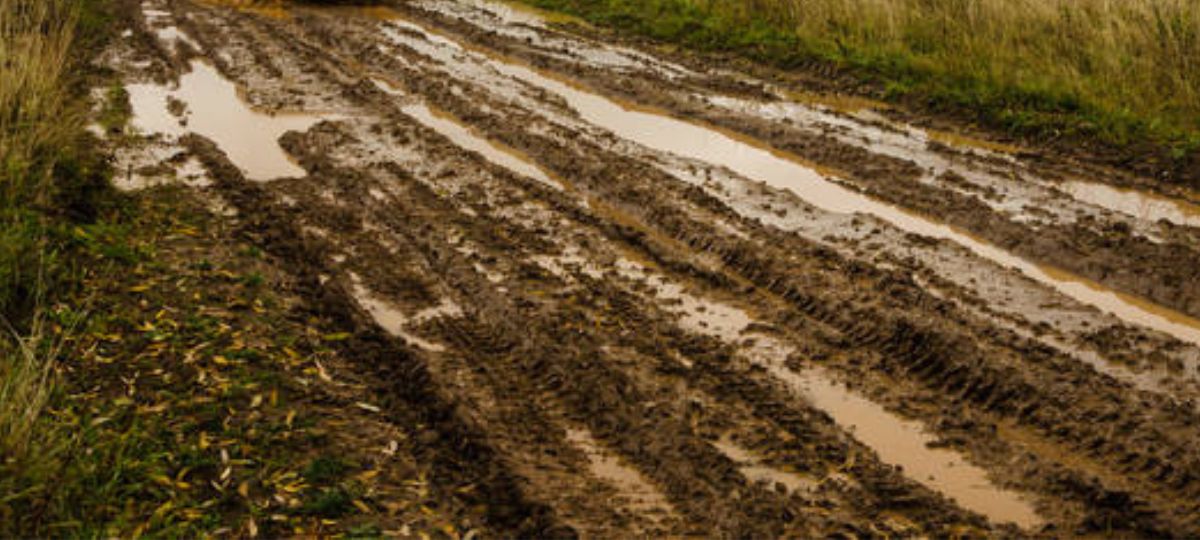 Дальше женщина показывает путь к дому — сплошную грязь, лужи и колеи.