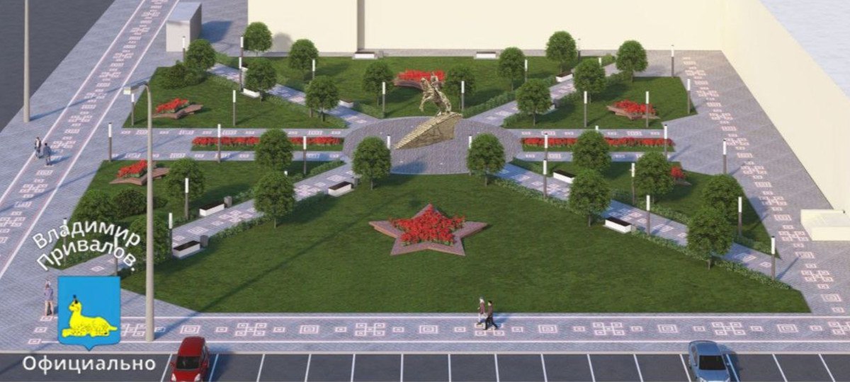 Председатель горисполкома Владимир Привалов уже представил визуализацию «обновленной территории»: открытое пространство без зелени, с фонарями, тротуарами и гранитными клумбами в форме коммунистических звезд. В центре композиции — Рокоссовский на коне.