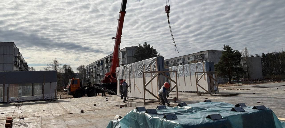 К весне стройка вошла в активную фазу. На площадке полностью завершили фундамент, построили чашу бассейна и приступили к монтажу здания. Именно здесь власти начали активно продвигать идею «уникальности» проекта. В отличие от привычных кирпичных детских садов, этот будет одноэтажным и выполненным преимущественно из деревянных каркасных панелей, произведенных в Шклове.