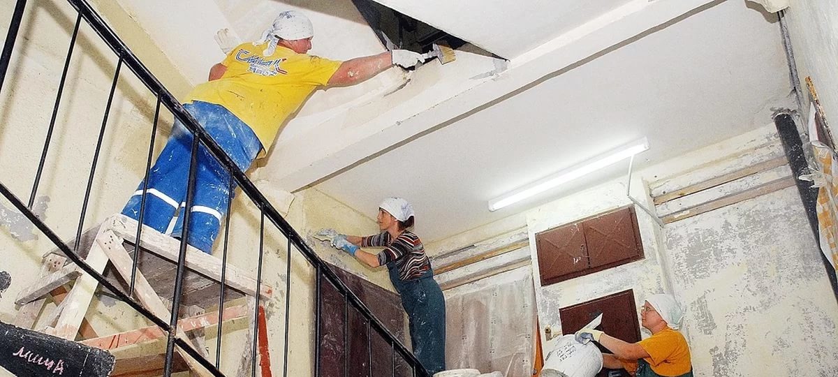 Работники делают капремонт дома внутри